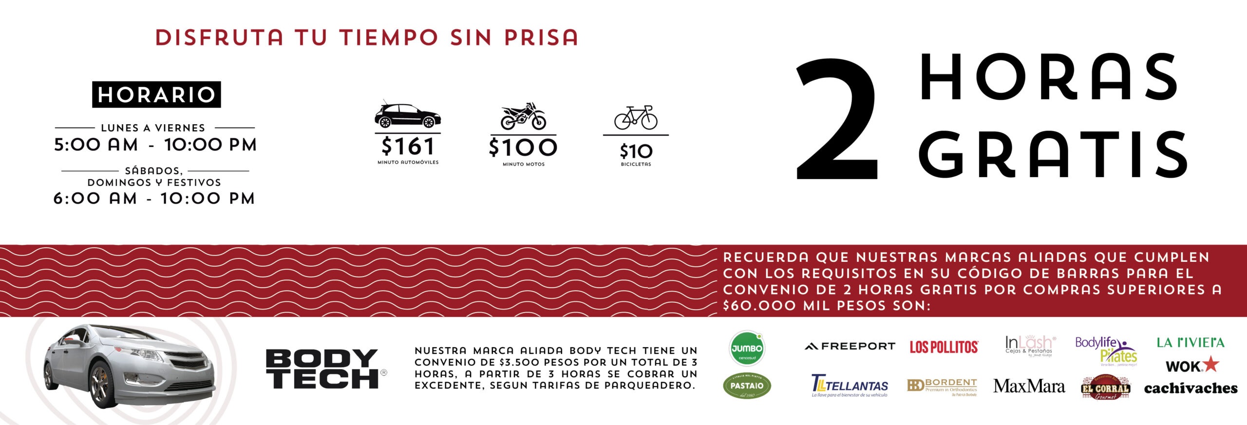 Nuestra marca aliada Body Tech tiene un convenio de $3.500 pesos por un total de 3 horas, a partir de 3 horas se cobrara un excedente, según tarifas de parqueadero.
